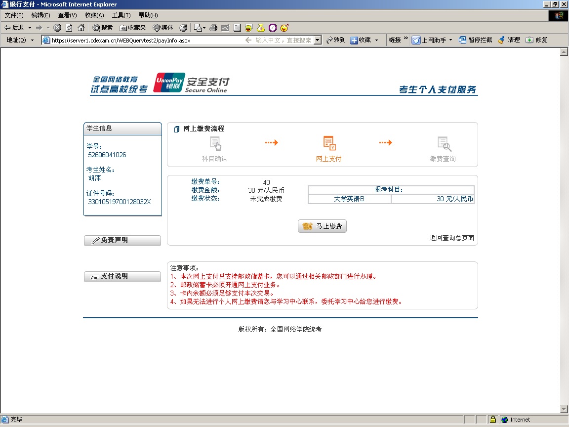 此页面中,可以显示详细的科目及金额信息。点击“马上缴费”,开始进行网上支持。