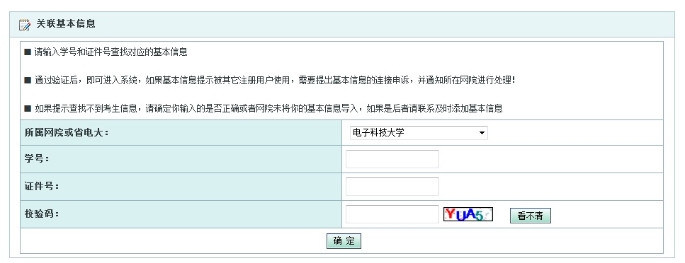 2)注册完毕后,系统会提示进行个人信息与数据库里信息的匹配,只要按提示步骤进行操作便可,如图。所属网院请选择“电子科技大学”,切勿选成其他学校。学生应仔细认真核对自己的个人信息,如有问题,应向学习中心提出,学习中心查证后向总校提出修改。