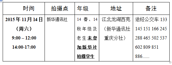 本次摄像是针对今年集体摄像因故未能照相的同学(14春、14秋年级及之前年级的老生)参加新华社图像采集个人零散拍摄的通知,请同学位于下周六2015年11月14日尽量早一些到新华通讯社参加个人零散拍摄。注意事项如下: