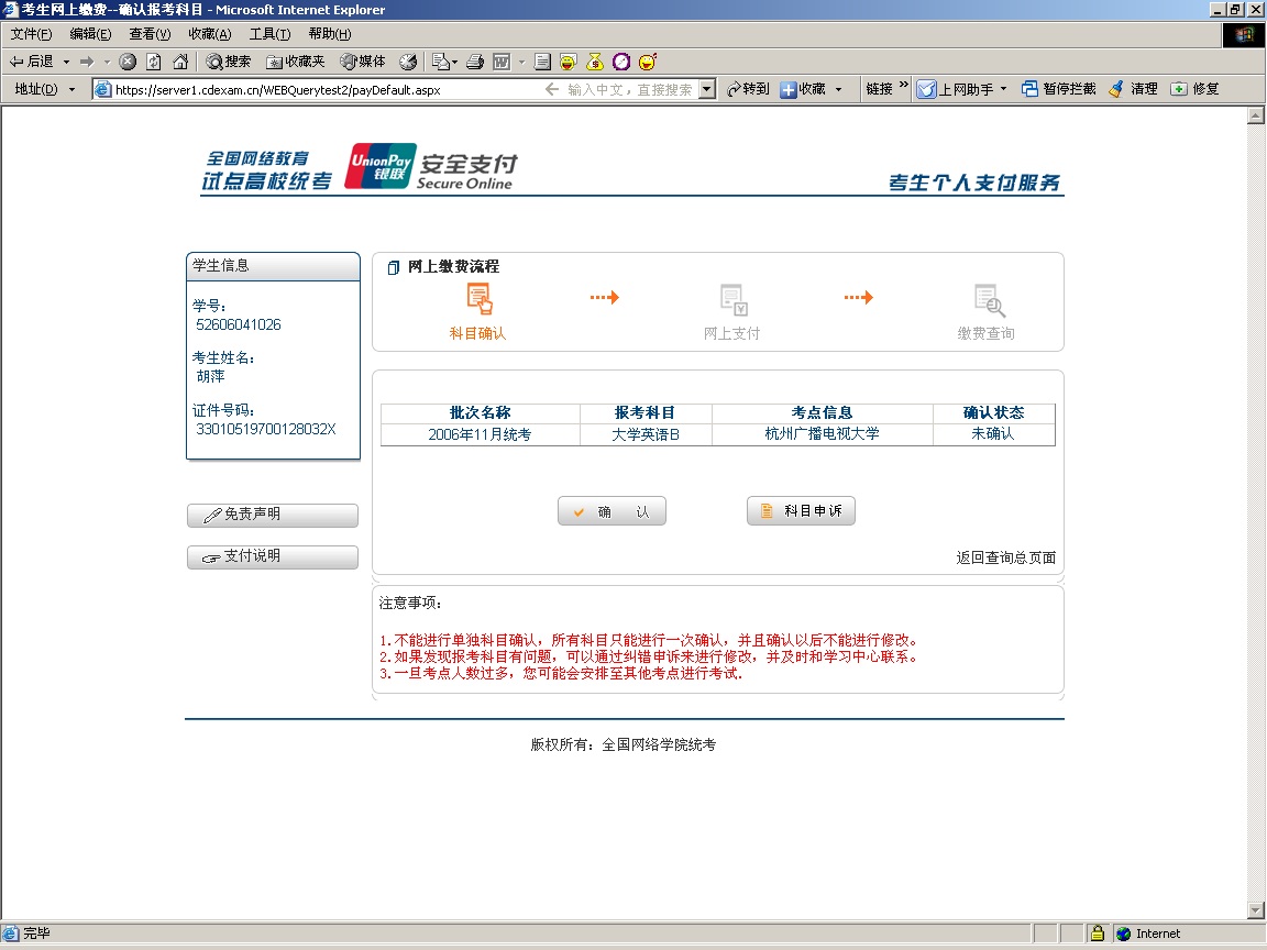 进入科目确认网页,考生需要注意的是: