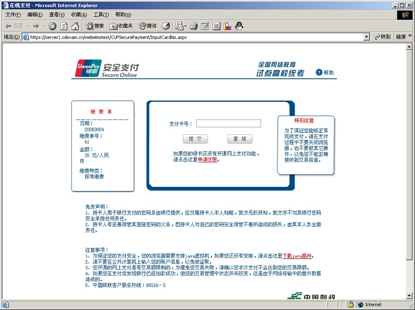 考生在输入卡号前,需详细阅读该页面的所有提示信息。