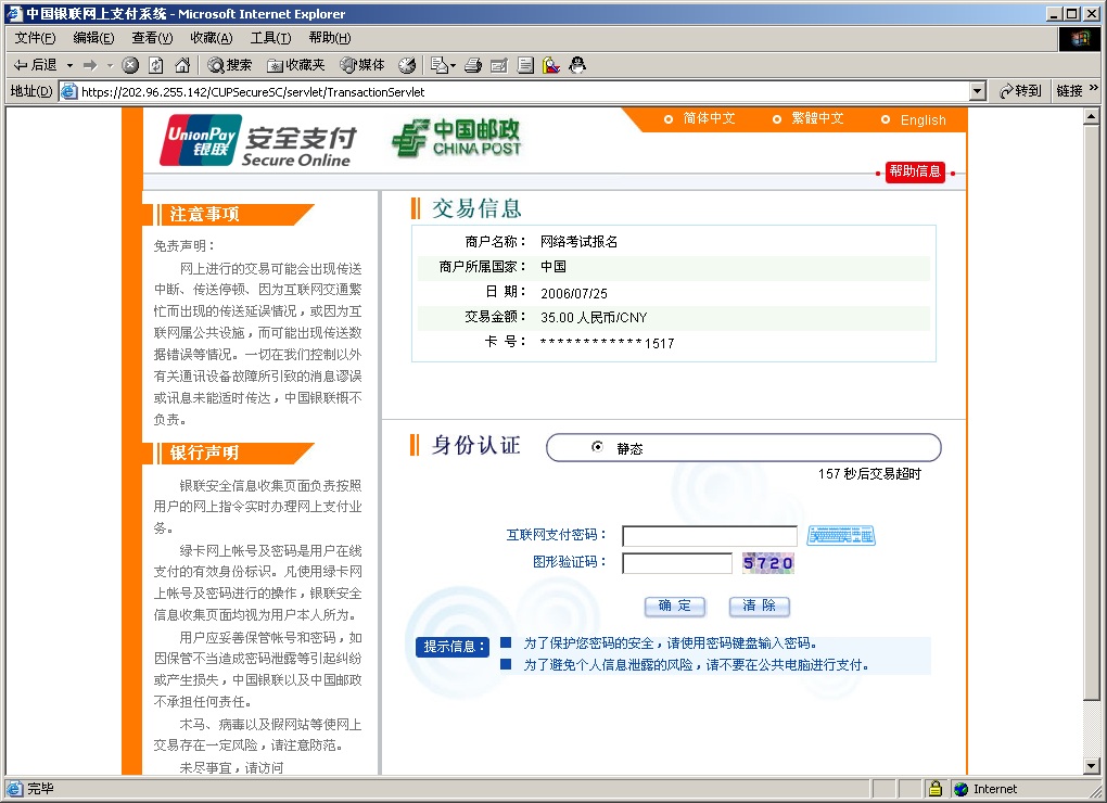 该页面的互连网支付密码为您的邮政储蓄卡的密码,输入时必须用鼠标点击虚拟键盘进行输入,用于确保您的卡号及密码信息的网络安全传输。