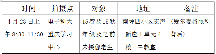 四、14秋及之前年级未照的同学必须到,否则后果自负。对本次因故未能照相的学生,请你们关注学习中心群Q 每年4月及11月关于新华社图像采集通知(或自己与新华社89187174联系拍摄;电子科技大学继续教育学院代码:10614)。